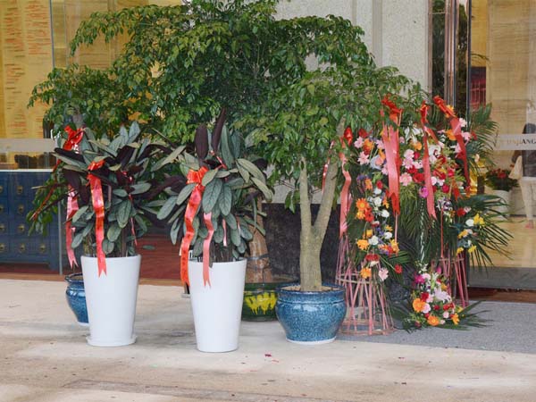 放鞭炮,挂红绸、图的就是一个彩头。用花也得这样来一些红彤彤、喜庆的...